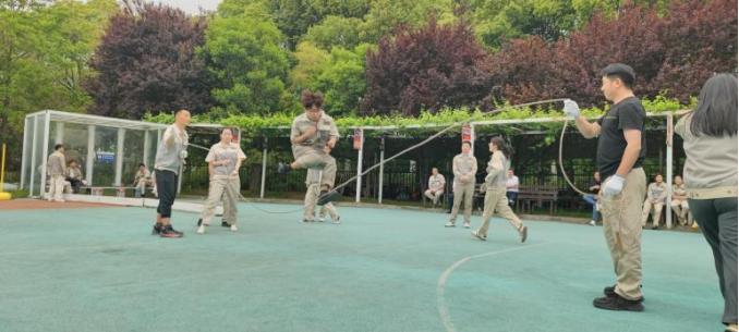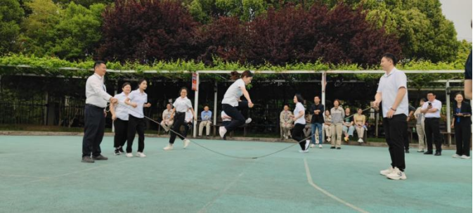 首先進行的是穿龍跳繩比賽。每支參賽隊伍由 10 名隊員組成,其中 2 人搖繩,8 人跳繩。隨著裁判的一聲哨響,搖繩的隊員迅速揮動手中的繩子,跳繩的隊員們則如敏捷的飛燕,一個接一個地穿過飛舞的跳繩。他們步伐整齊,節奏一致,口中喊著響亮的口號,為了團隊的榮譽而奮力拼搏。現場觀眾的加油聲、歡呼聲此起彼伏,整個賽場沉浸在一片歡樂的海洋中。這個項目不僅考驗了大家的協調性和敏捷性,還考驗了團隊成員之間的默契。有的隊伍配合得天衣無縫,動作流暢;有的隊伍則在歡聲笑語中出現了一些小插曲,但正是這些小插曲,為運動會增添了不少樂趣。
