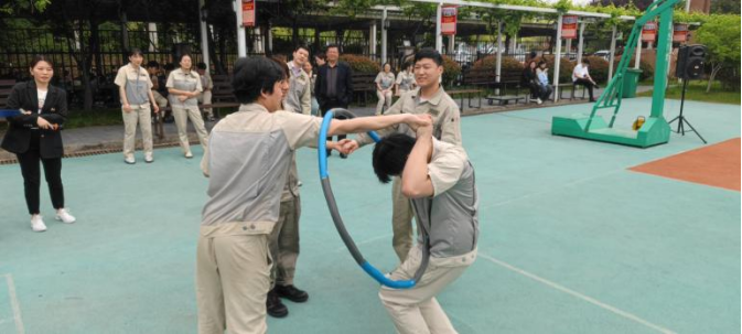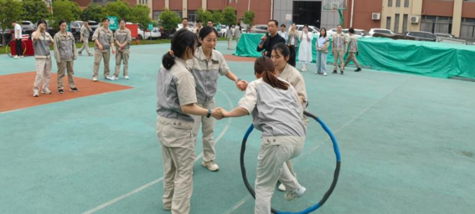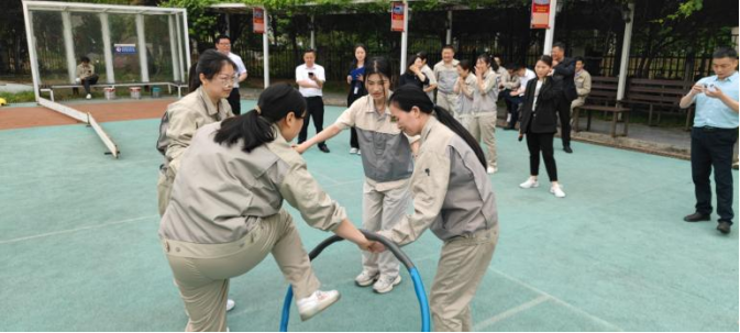 接下來的一圈到底比賽同樣精彩紛呈。4 人手拉手圍成圓圈站立,全程不得松手,呼啦圈掛在一人手臂上,裁判喊開始后,隊員需通過扭動身體、抬腿、低頭等方式,將呼啦圈從自己身上穿過并傳遞給下一人,完成三圈傳遞結束,用時最短的隊伍獲勝。比賽中,各隊隊員們緊密合作,充分發揮自己的靈活性和協調性,想盡辦法加快傳遞速度。有的隊伍利用身體靈活快速完成,有的隊伍不小心卡住了,但隊友們絲毫沒有抱怨,而是相互鼓勵,共同完成任務。則身體笨重采用了快速穿越的方式,有的隊伍則注重保持隊伍的穩定性,在穩中求勝。最終,鈑二代表隊憑借高效的傳遞技巧和緊密的團隊協作,贏得了一圈到底比賽的冠軍。